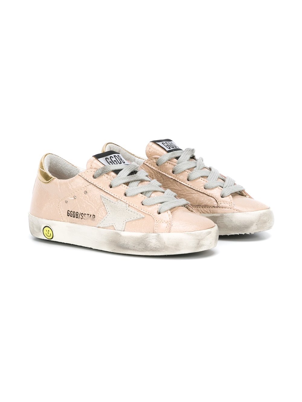 - GOLDEN GOOSE DELUXE BRAND KIDS 粉红色 漆皮 'Superstar'板鞋。 圆头, 正面绑带, 鞋垫饰有品牌标识, 正面和侧面有标志, 仿旧效果, 平底橡胶鞋底。