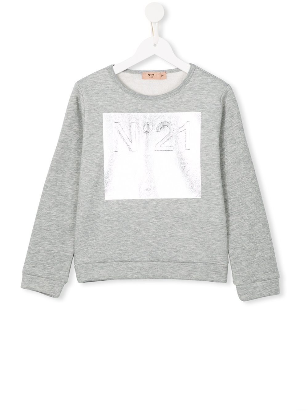 - Nº21 KIDS 灰色与银色 棉质混纺 标志印花套头衫。 圆领, 长袖。
