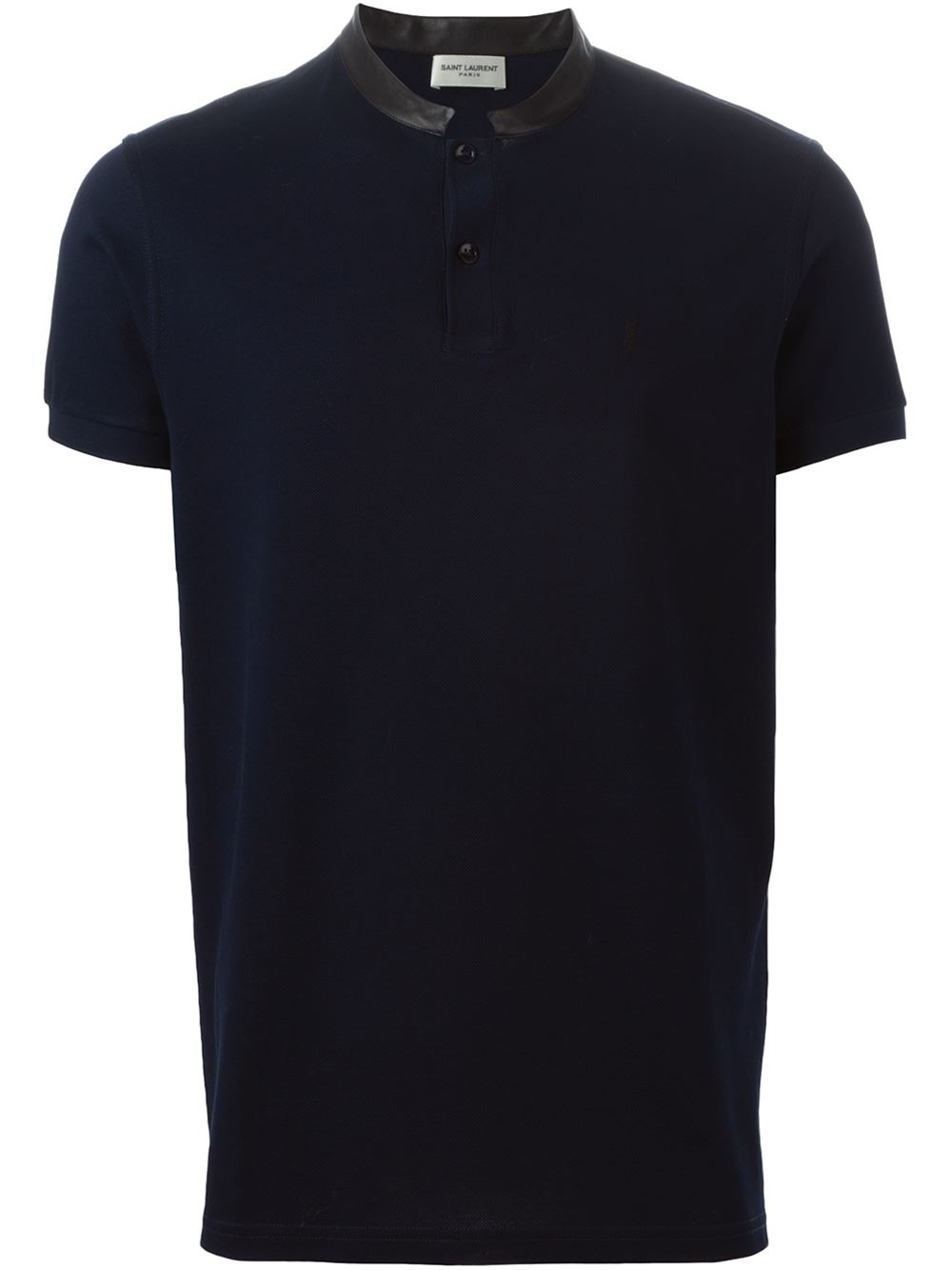 - Saint Laurent 深蓝色 棉质 立领polo衫。 直领, 正面纽扣, 短袖, 胸处饰有对比刺绣标志, 平直下摆。