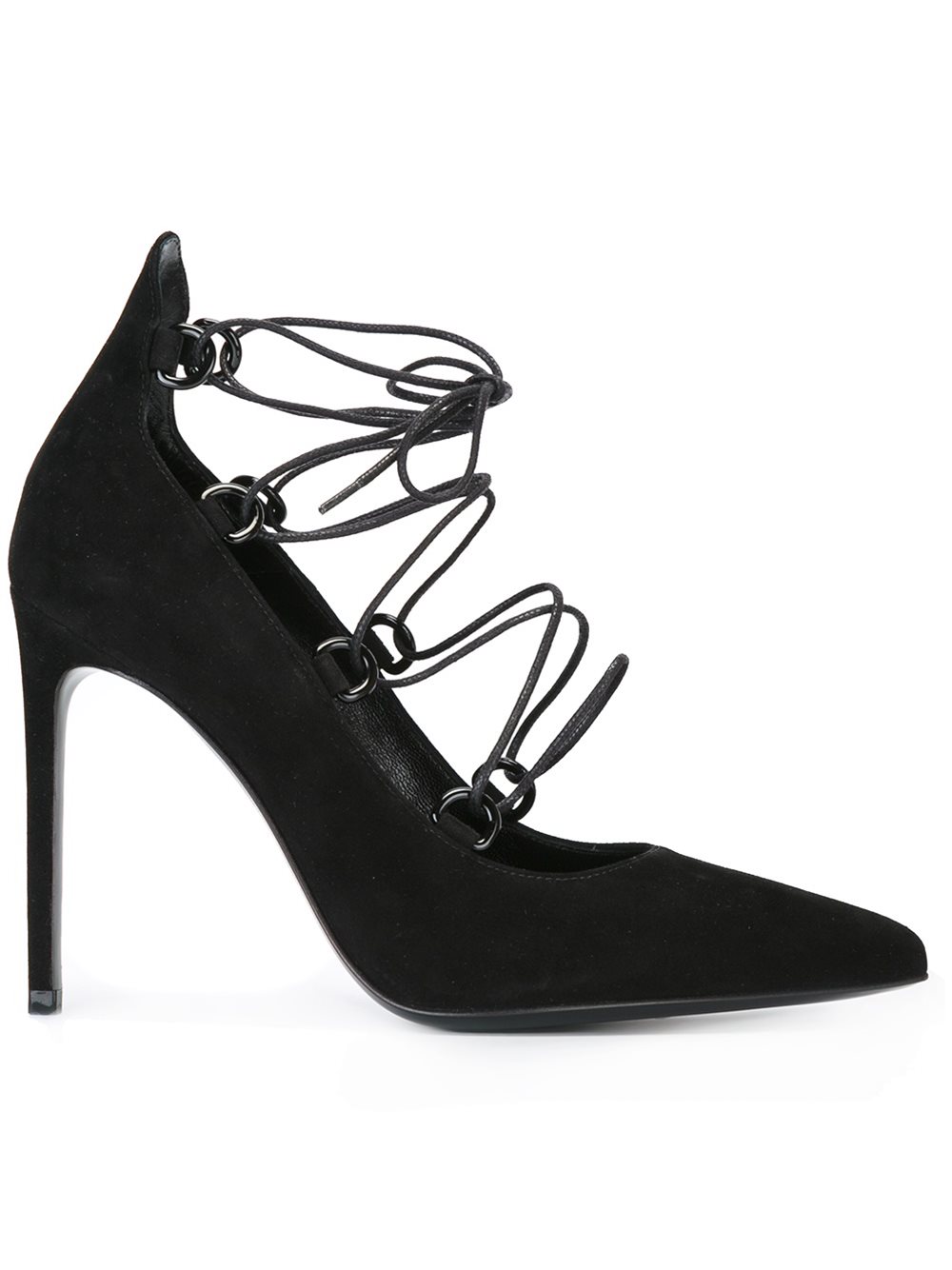 - Saint Laurent (圣罗兰) 黑色 绒面皮 'Paris'系带高跟鞋。 尖头, 正面绑带, 鞋垫饰有品牌标识, 细高跟。