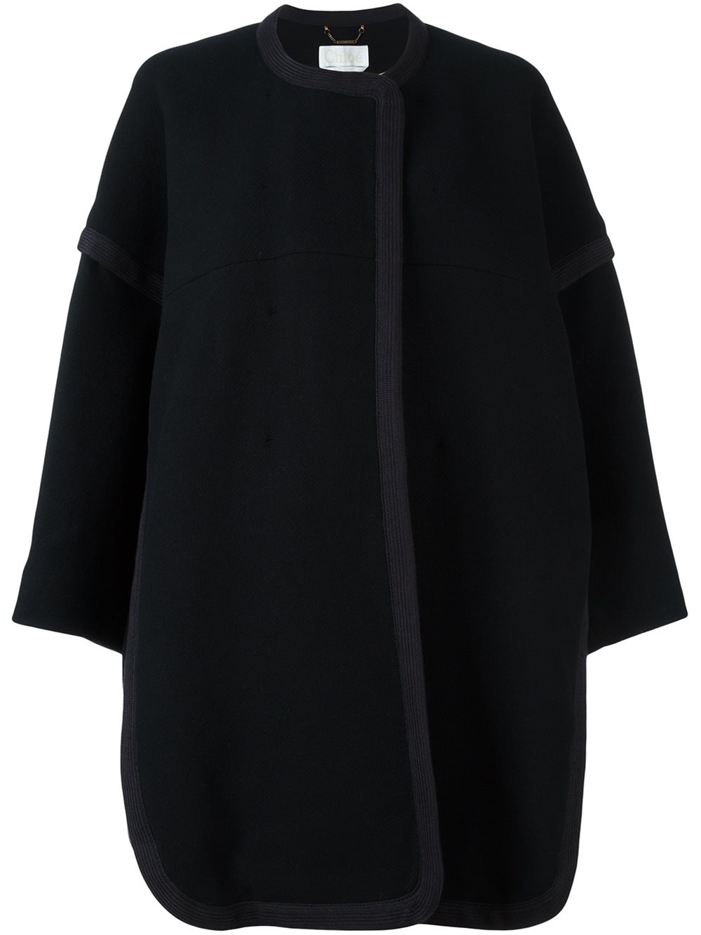 - Chloé (寇依) 海军蓝色 初剪羊毛混纺 茧形外套。 圆领, 正面有双排扣, 隐藏式拉链, 侧身口袋, 长袖, 短款, 平直下摆。