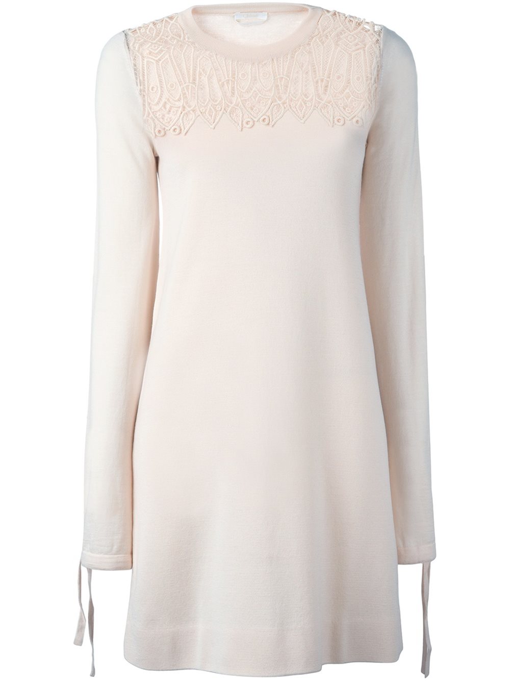 - Chloé (寇依) 浅粉色 羊毛丝质混纺 蕾丝刺绣针织连衣裙。 罗纹针织圆领, 长袖, 绑带袖口, 直筒裙式廓形, 短款。