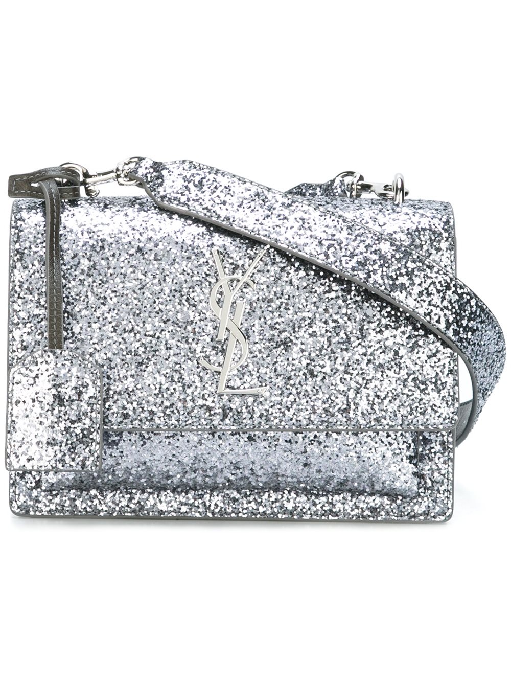 - Saint Laurent (圣罗兰) 银色 'Sunset Monogram'小号斜挎包。 可拆卸肩带, 银色五金配件, 钥匙吊, 正面标志贴, 翻盖饰有插入式的摁扣, 内置多个卡槽, 金葱胶细节。