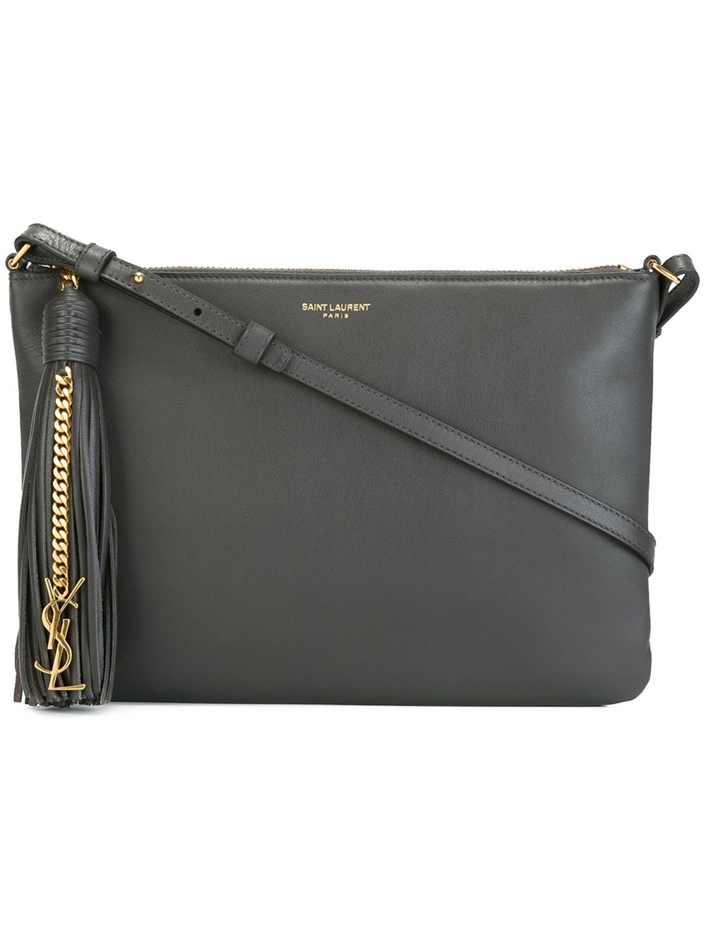 - Saint Laurent (圣罗兰) 灰色 小牛皮 'Monogram'斜挎包。 可调肩带, 正中有品牌标记, 顶置拉链, 流苏挂饰, 内置贴袋, 内置标牌。