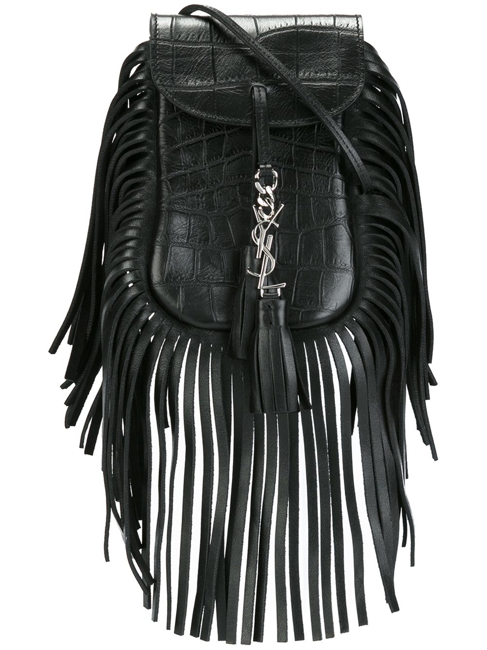 - Saint Laurent (圣罗兰) 黑色 小牛皮 'Anita'toy斜挎包。 肩带, 带浮雕及鳄鱼皮效果, 流苏边, 银色标牌, 流苏挂饰, 翻盖饰有插入式的摁扣。