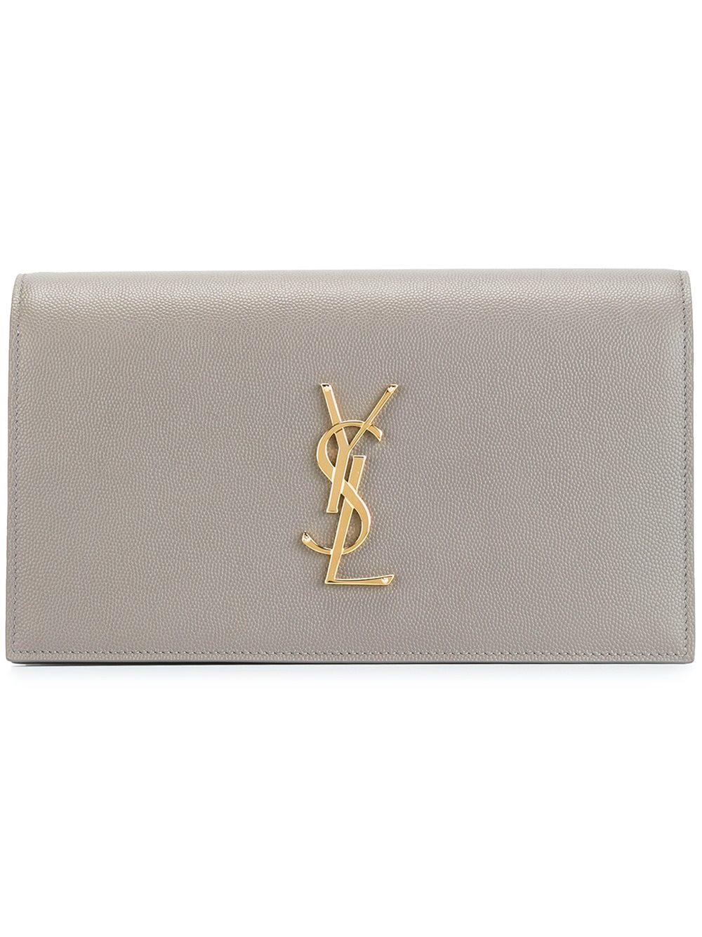 - Saint Laurent (圣罗兰) 灰色 小牛皮 'Monogram'手拿包。 正面标志贴, 金色五金配件, 翻盖饰有摁扣, 内置标签, 内置贴袋, 内置标牌。