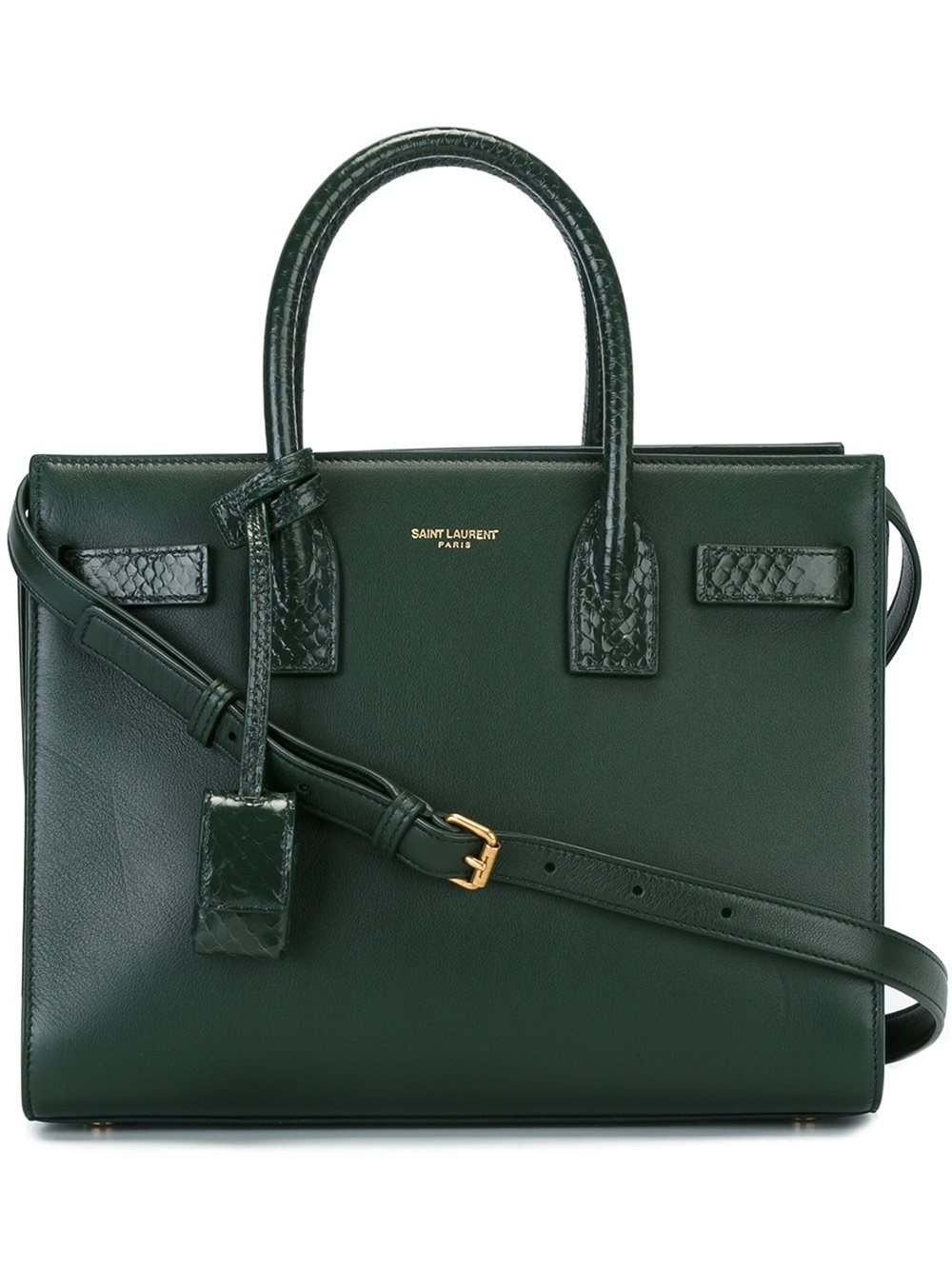 - Saint Laurent (圣罗兰) 深绿色 小牛皮 'Sac de Jour'baby手提包。 顶部有弧状手柄, 可拆卸可调肩带, 金色五金配件, 正中有品牌标记, 皮质吊牌, 蛇皮拼接, 双边可延展, 无开合设计, 内置拉链夹层, 内置贴袋。