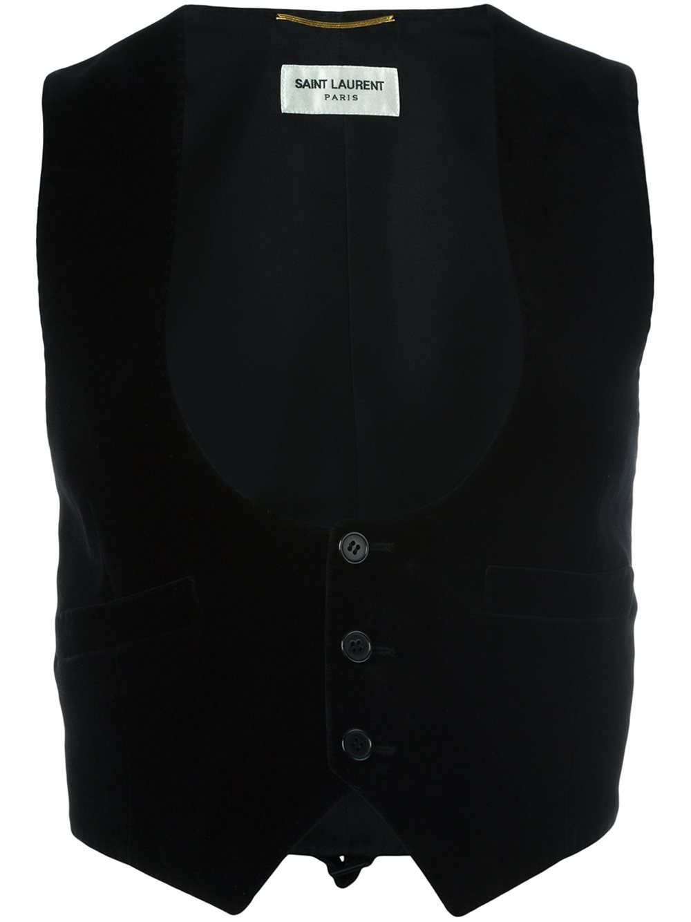 - Saint Laurent (圣罗兰) 黑色 丝绸与全棉 丝绒西式马甲。 深U字领, 正面纽扣, 两个正面口袋, 无袖设计, 曲线形底边, 全衬里。