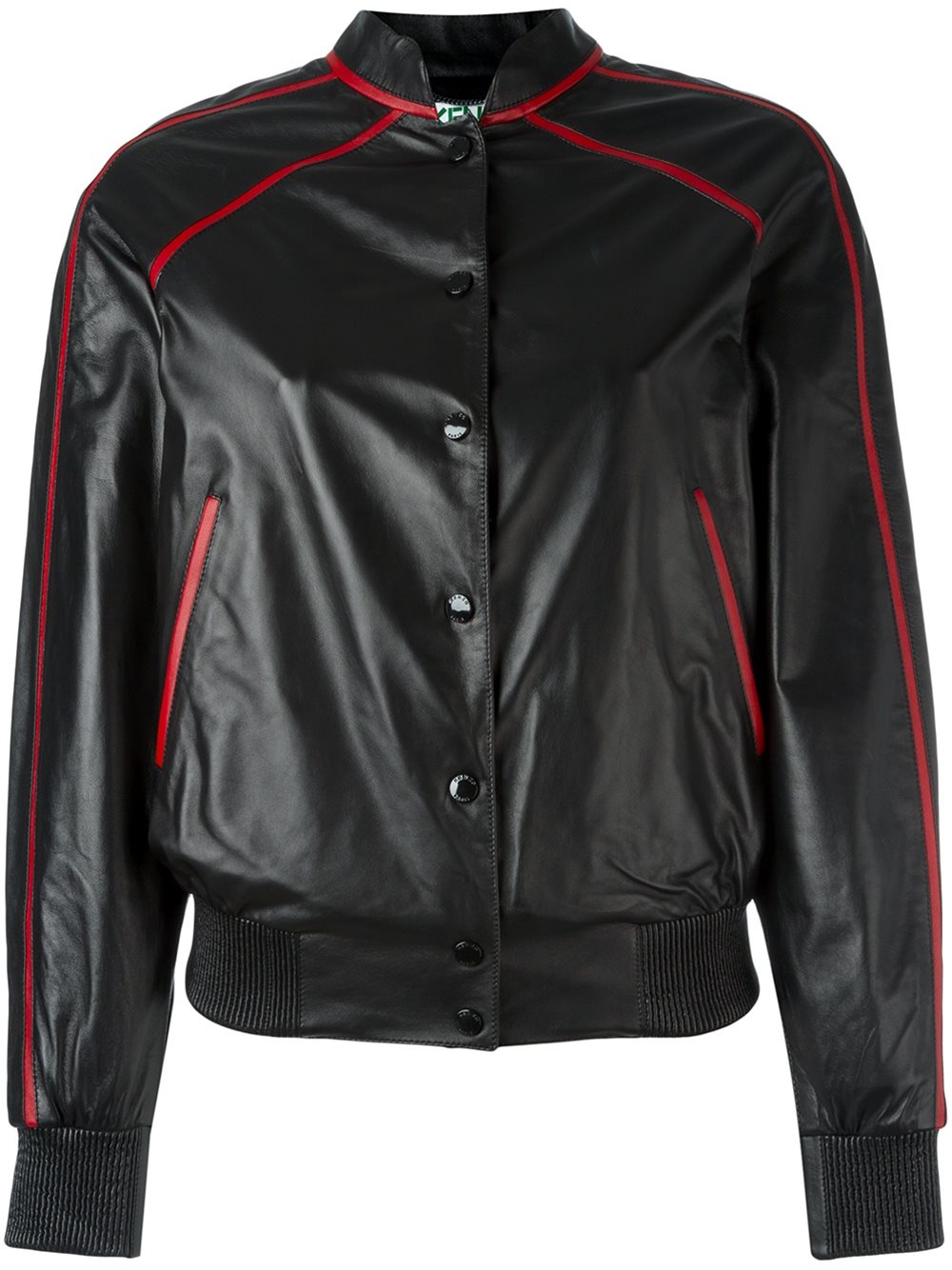 - Kenzo (高田贤三) 黑色 小羊皮 刺绣外套。 立领, 摁扣, 两个正面口袋, 长袖, 弹性松紧底边。