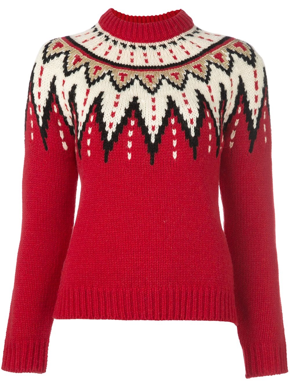 - Saint Laurent (圣罗兰) 红色与白色 羊毛 对比图纹毛衣。 罗纹针织圆领, 长袖, 罗纹底边及袖口。