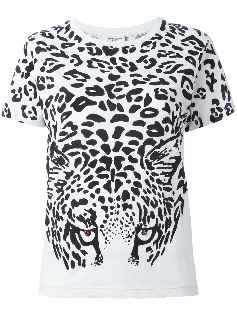 - Saint Laurent (圣罗兰) 白色与黑色 全棉 豹纹T恤。 圆领, 短袖, 豹纹, 水晶镶嵌, 平直下摆。