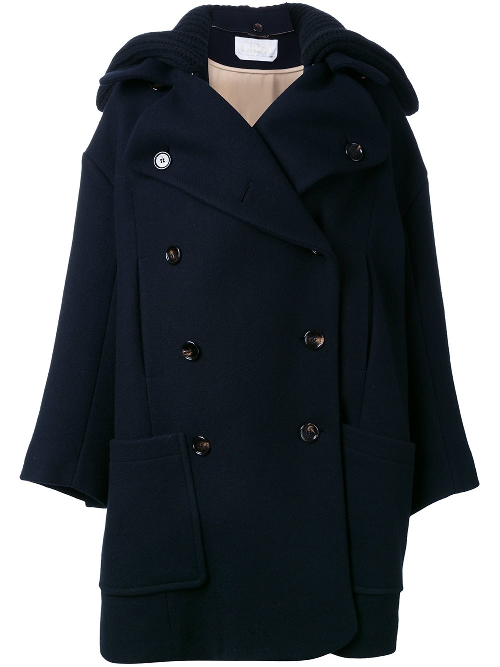 - Chloé (寇依) 海军蓝色 初剪羊毛丝绸混纺 双排扣外套。 梯形翻领, 侧置口袋, 贴袋, 正面有双排扣, 长袖, 中长, 平直下摆。