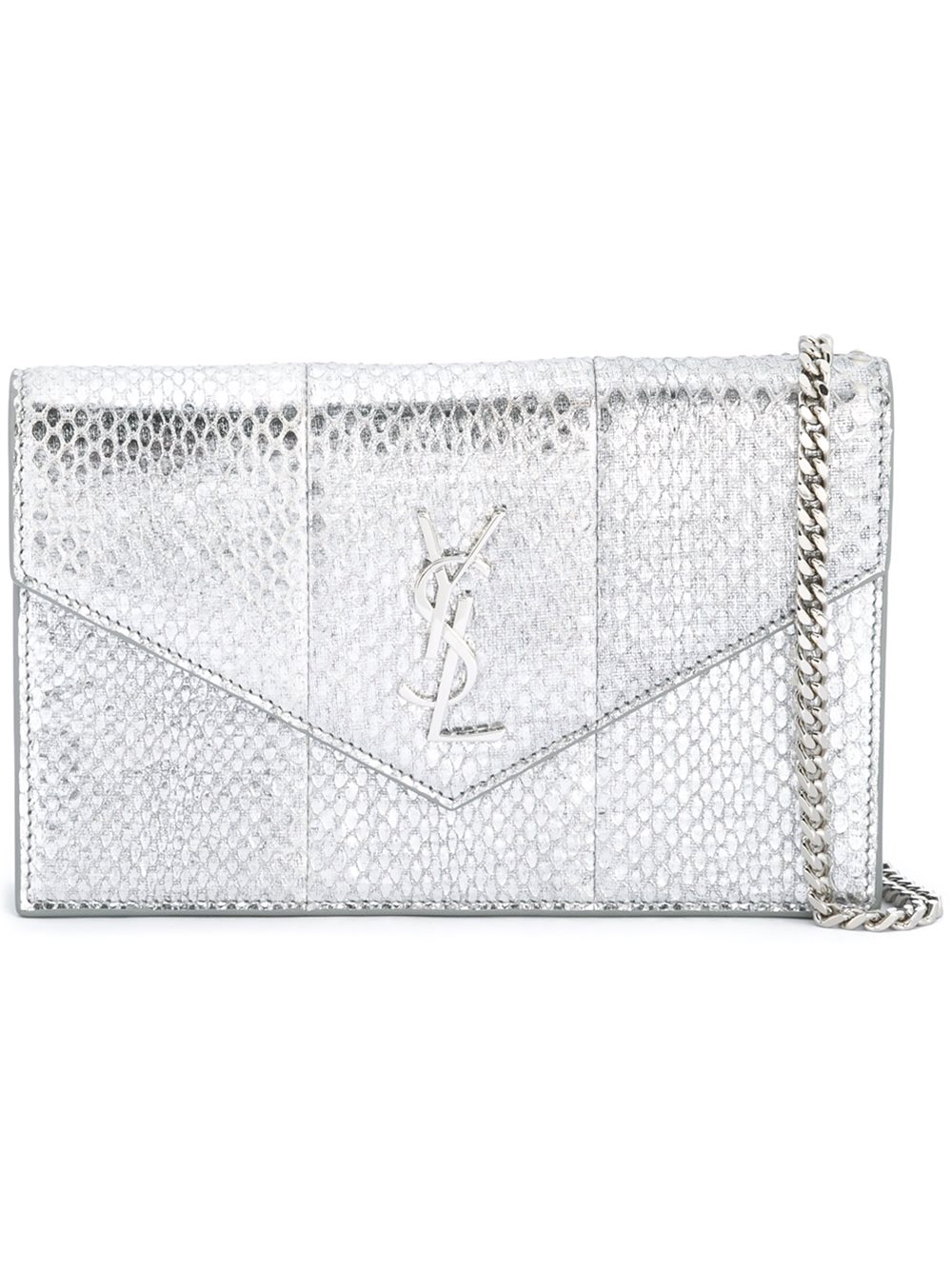 - Saint Laurent (圣罗兰) 银色 蛇皮 'Monogram'铁链肩带钱包。 搭链肩带, 银色五金配件, 正面标志贴, 信封式, 翻盖饰有插入式的摁扣, 内置标签, 内置拉链夹层。请注意,这件商品不能寄到欧盟以外。