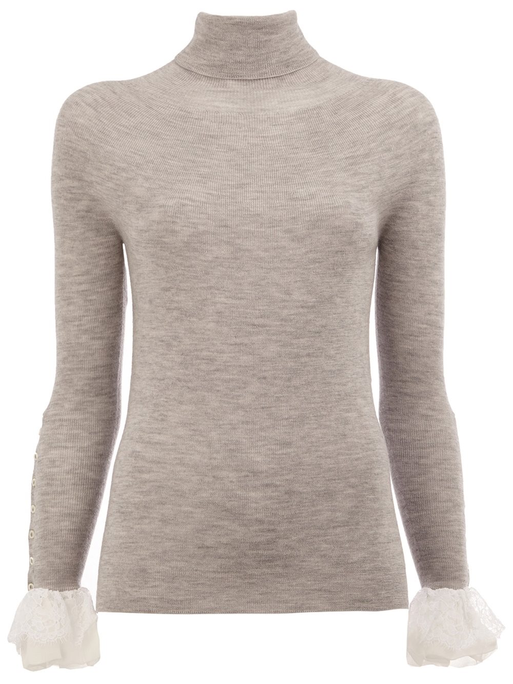 - Oscar de la Renta 浅灰色 初剪羊毛 荷叶边袖口毛衣。
