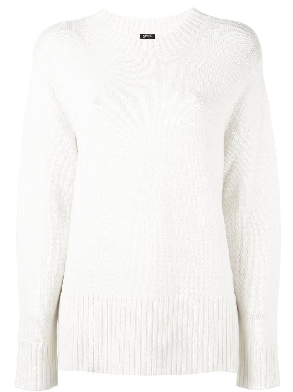 - Jil Sander Navy 白色 羊毛 超大款毛衣。 罗纹底边及袖口, 罗纹针织圆领。