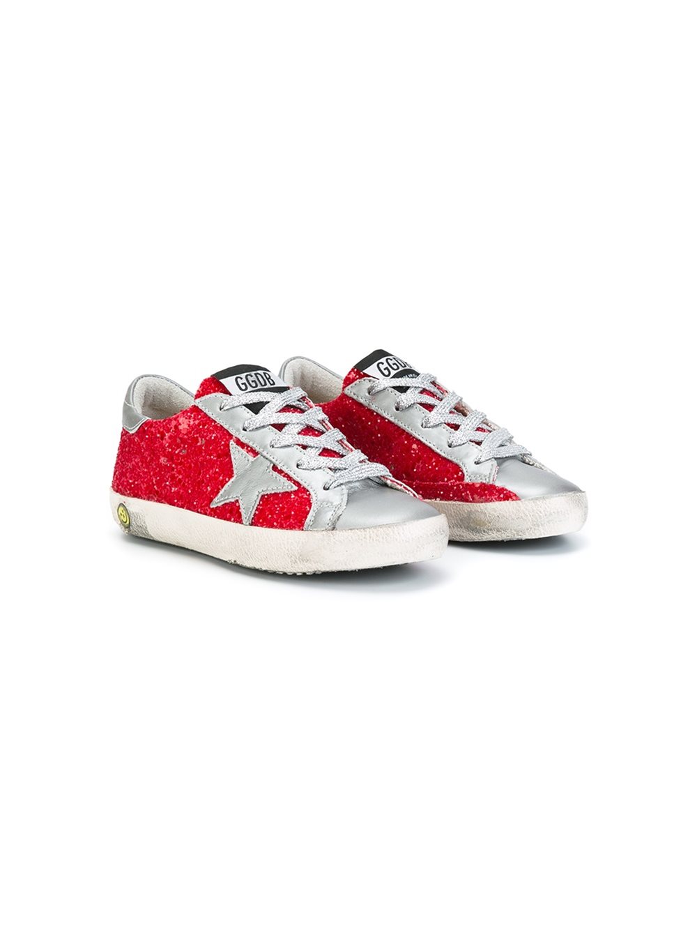 - GOLDEN GOOSE DELUXE BRAND KIDS 红色 牛皮 'Superstar'运动板鞋。 金葱胶细节, 正面绑带, 仿旧效果, 圆头, 橡胶质抓地鞋底。