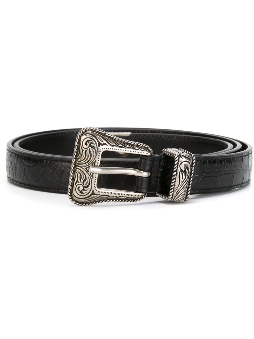 - Saint Laurent 黑色 小牛皮 西部风扣环腰带。 带浮雕及鳄鱼皮效果, 浮雕细节。