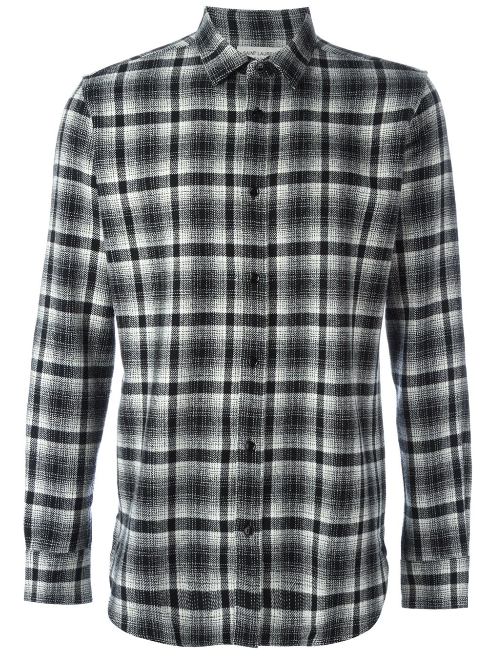 - Black and white wool blend classic Western checked shirt from Saint Laurent featuring a classic collar, a front button fastening, long sleeves, button cuffs and a curved hemline.