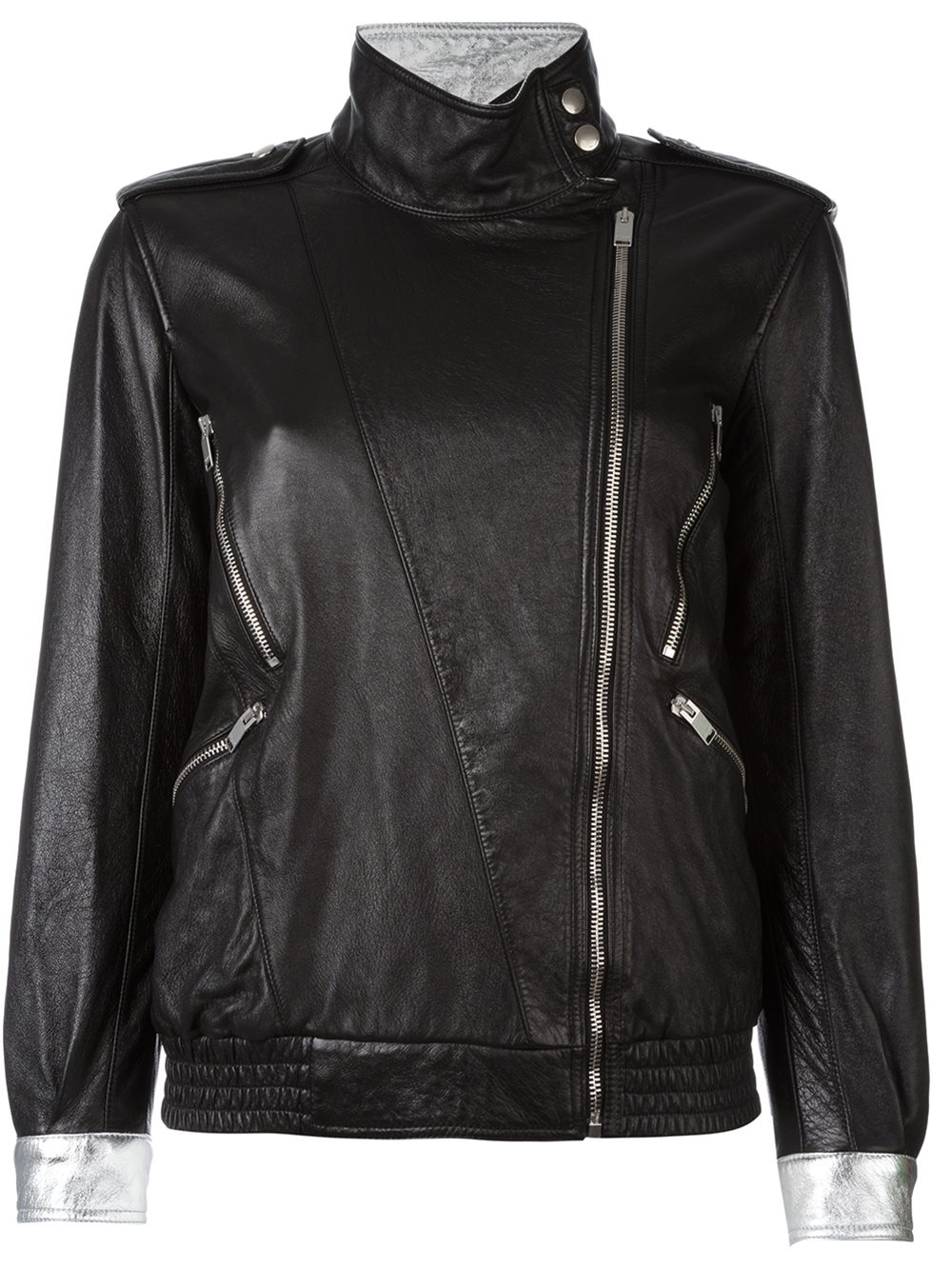 - Saint Laurent (圣罗兰) 黑色与银色 小羊皮 拉链细节夹克。 立领, 摁扣, 肩章, 偏中心正面拉链, 正面拉链口袋, 长袖, 袖口饰有摁扣, 弹性松紧底边, 全衬里。