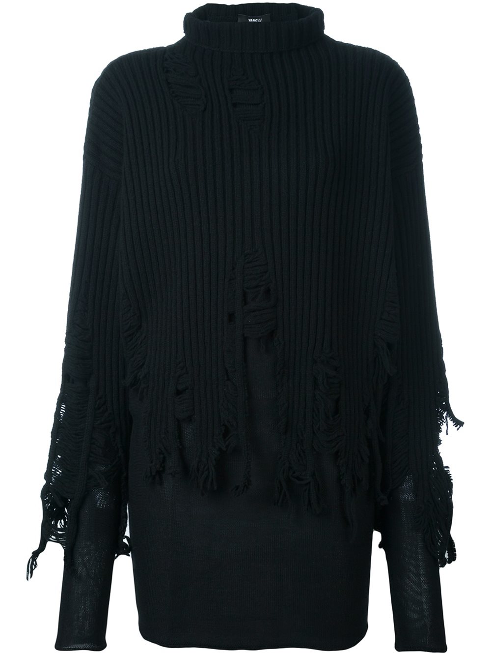 - Yang Li 黑色 羊毛与丝绸混纺 磨损细节毛衣。