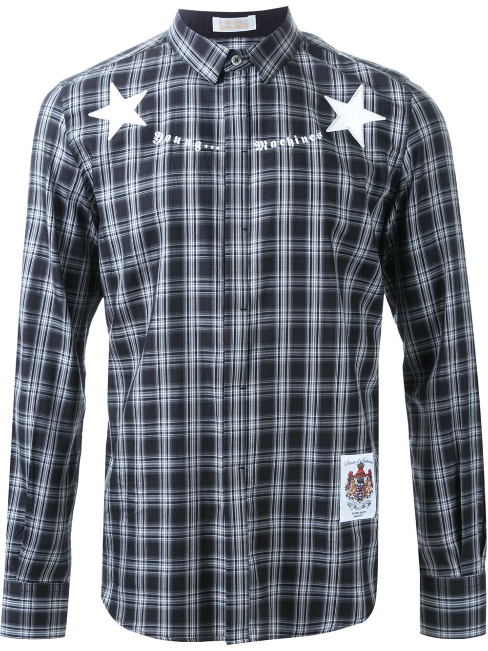 - Education from Youngmachines 黑色 全棉 格子星星印花纽扣衬衫。