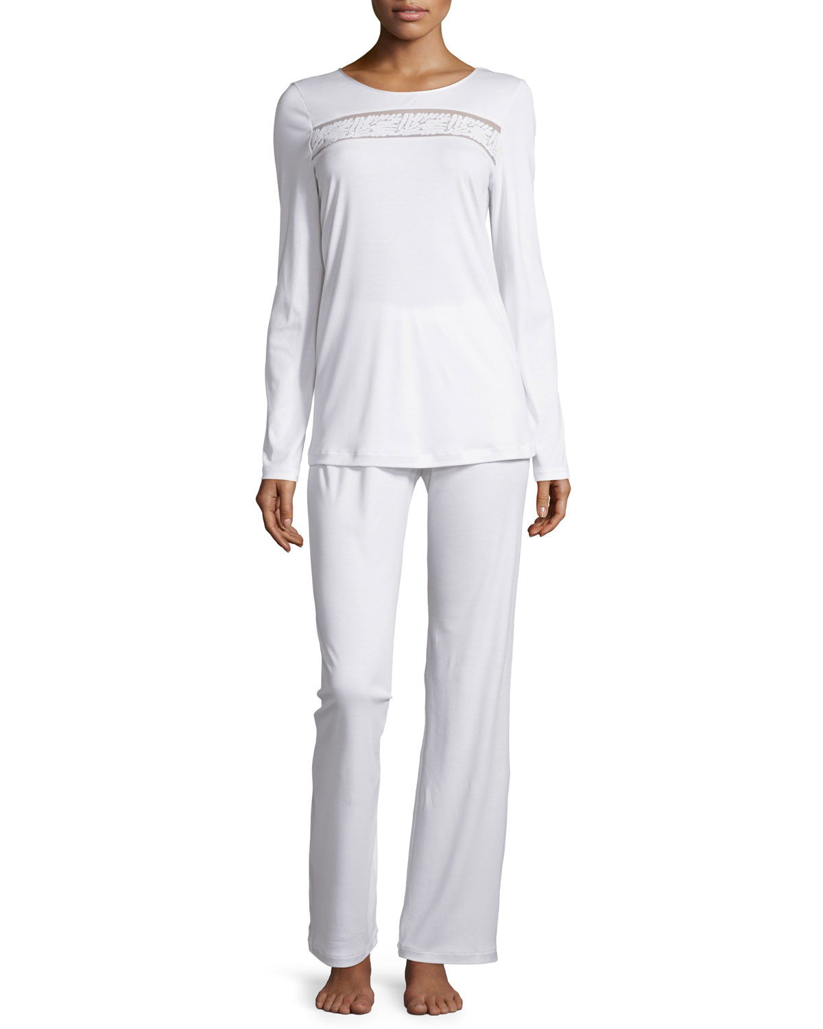 Hanro Franca Mesh-Inset Pajamas, Off White