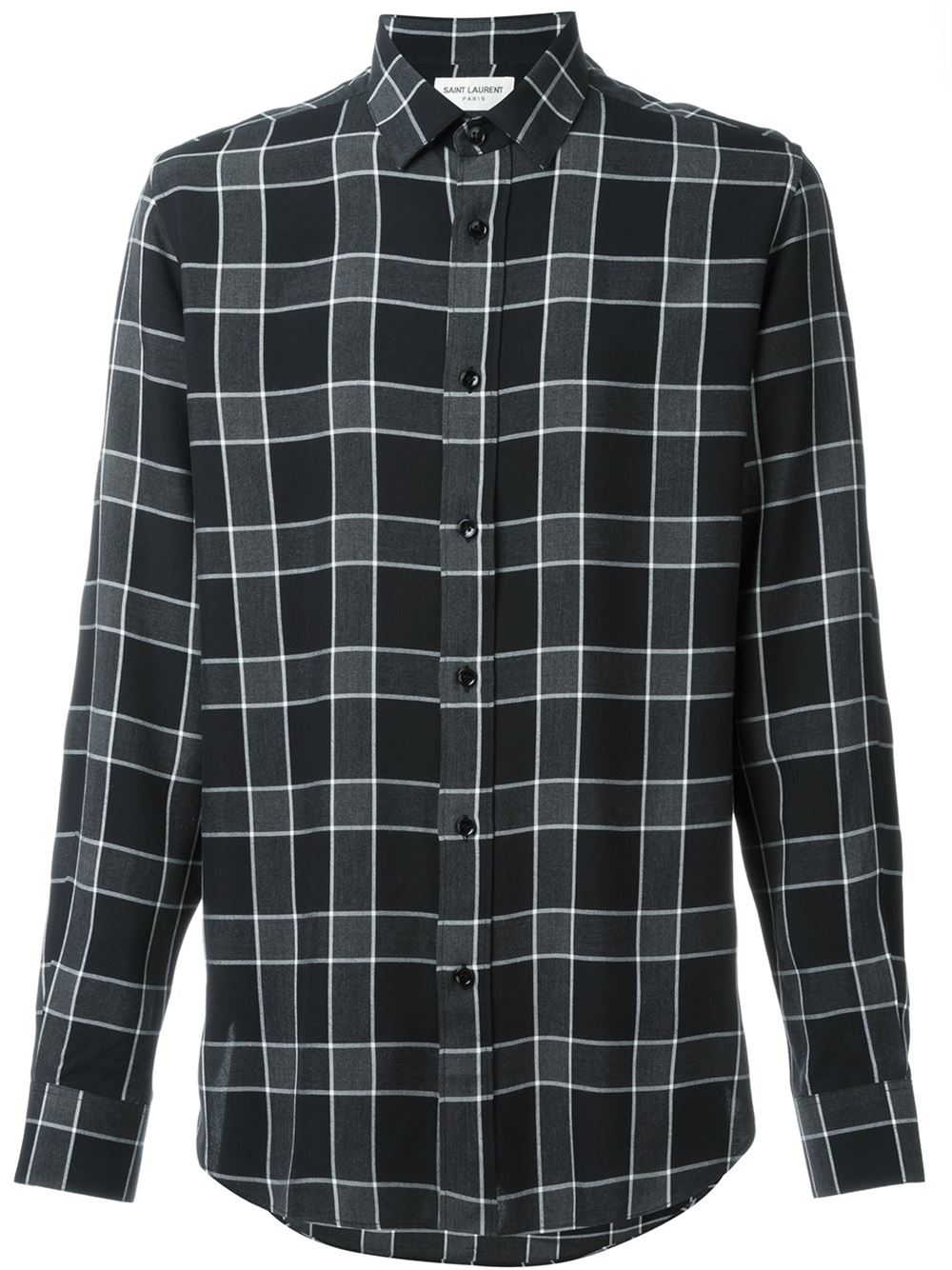 - Saint Laurent 灰色与黑色 格纹衬衫。 经典衣领, 正面纽扣, 长袖, 曲线形底边。