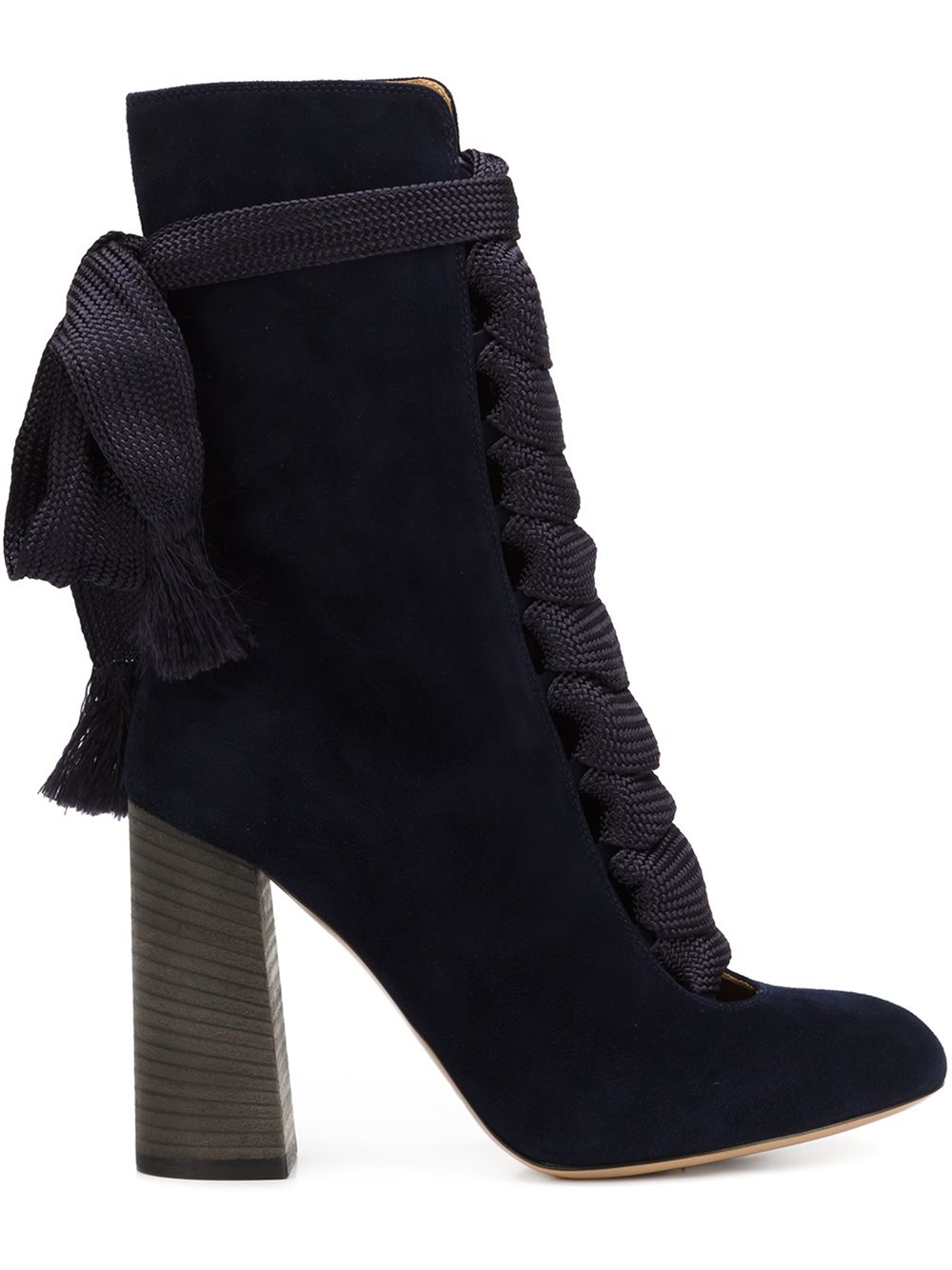 - Black leather lace-up boots from Chloé featuring an almond toe, a lace-up front fastening, an ankle length and a high heel.