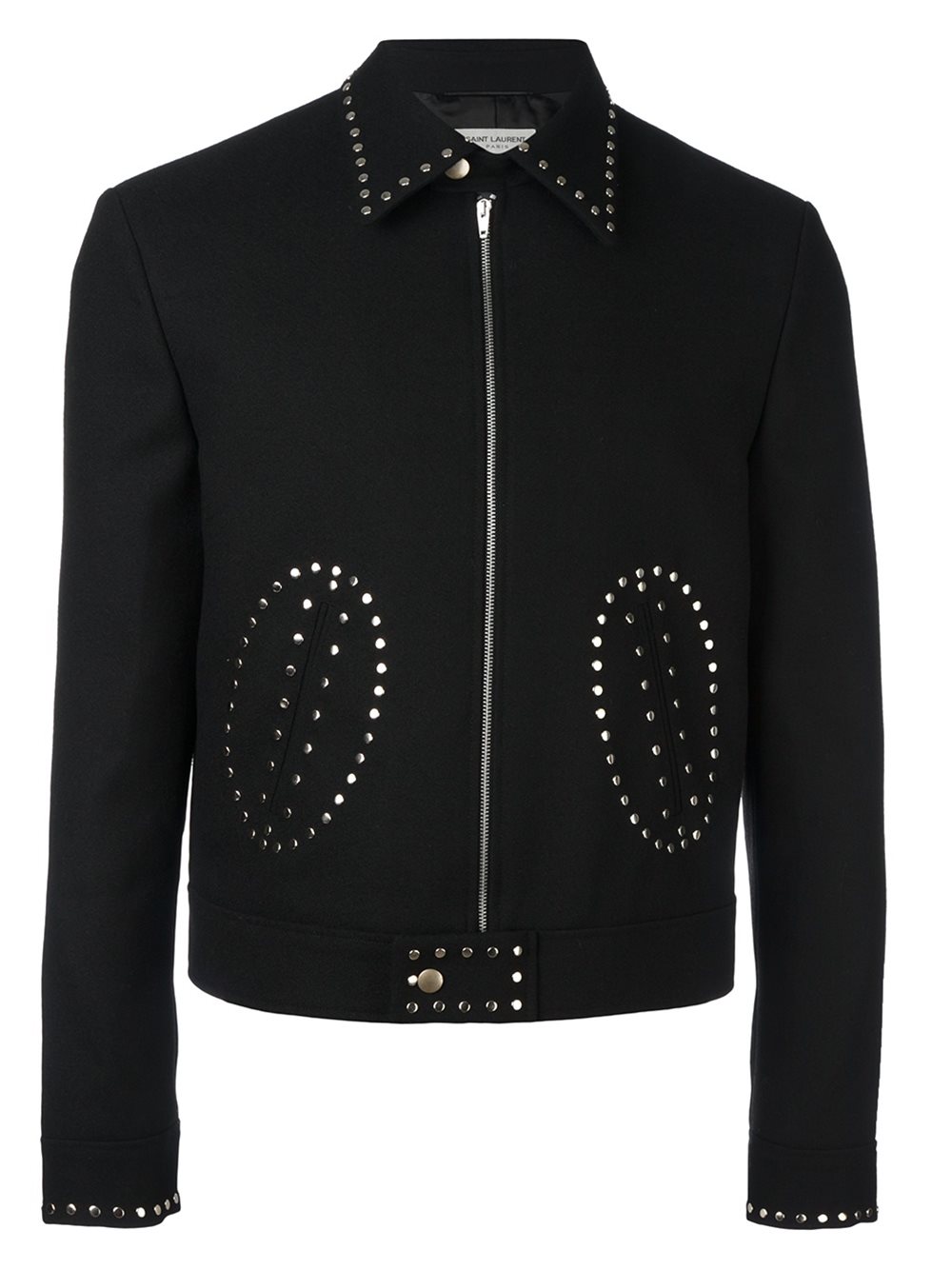 - Saint Laurent (圣罗兰) 黑色 全棉与羊毛混纺 铆钉短夹克。 尖领, 饰拉链和摁扣, 两个正面口袋, 银色铆钉, 长袖, 袖口饰有摁扣, 平直下摆, 全衬里。