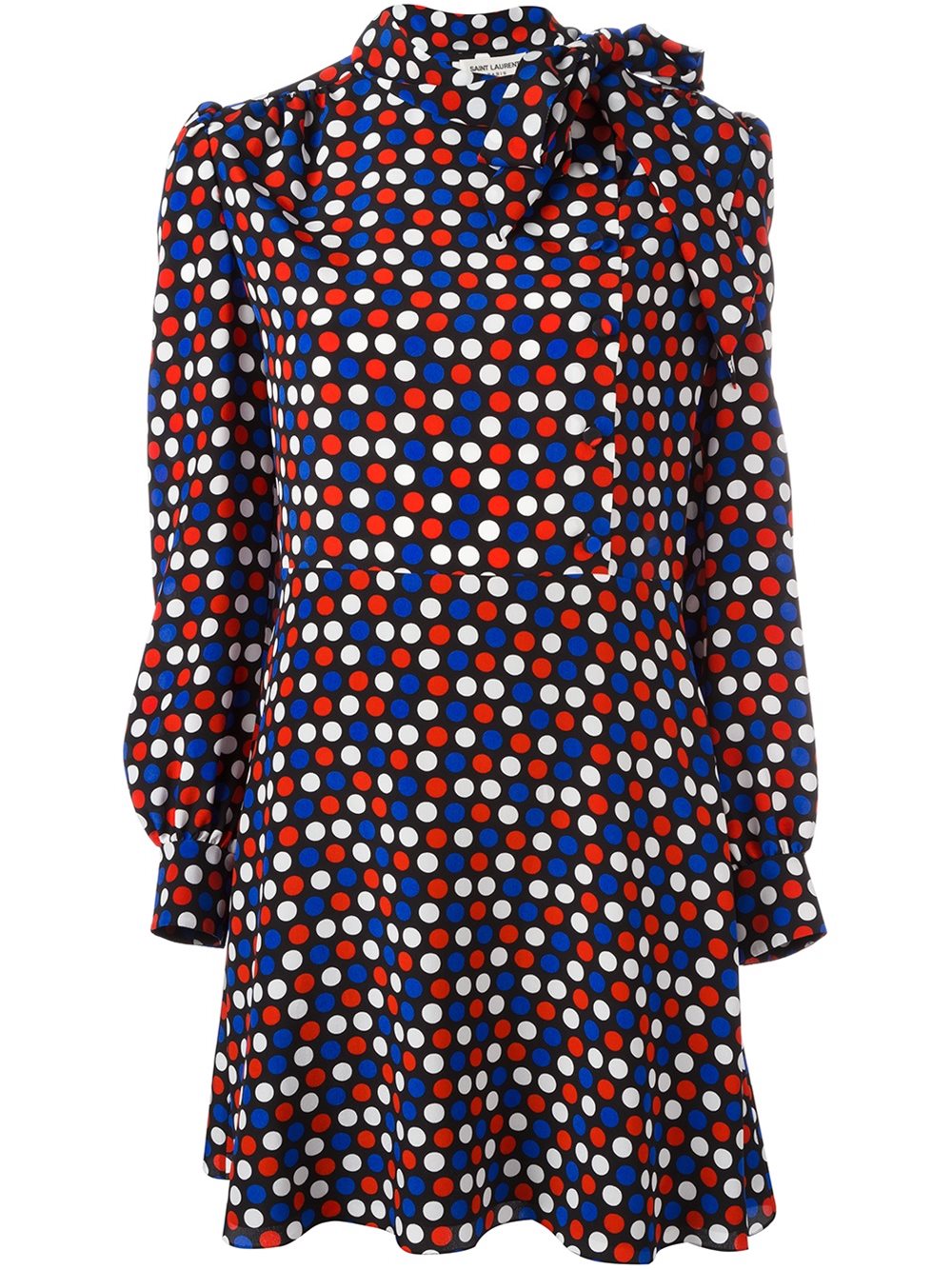 - Saint Laurent (圣罗兰) 黑色红色白色蓝色 丝绸 波点图案衬衫式连衣裙。 带结衣领, 大面积花纹, 侧置纽扣, 束腰, 长袖, 搭扣袖口, 伞状半身裙, 短款。