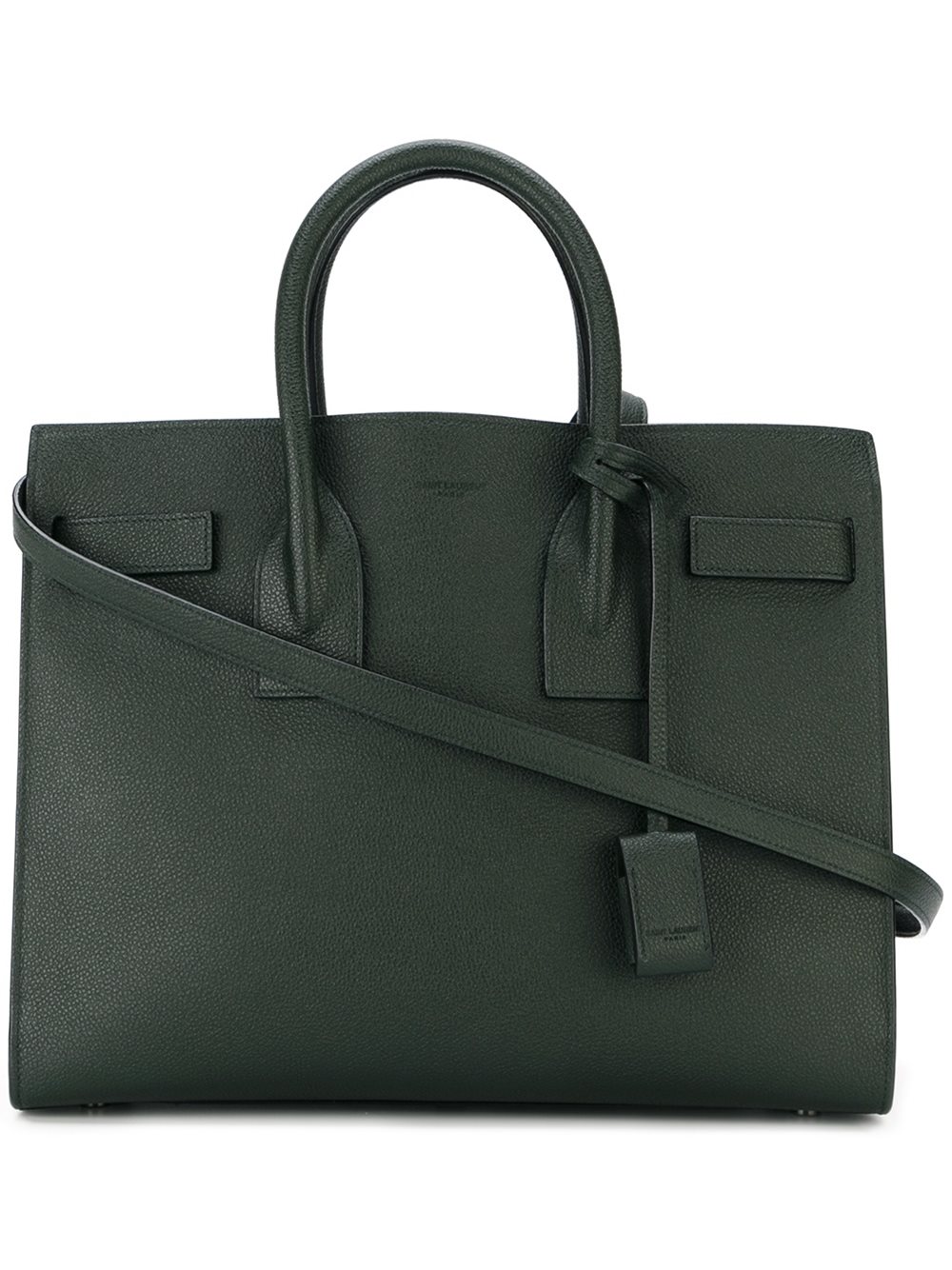 - Saint Laurent (圣罗兰) 绿色 小牛皮 'Sac de Jour'小号手提包。 顶部有弧状手柄, 可拆卸肩带, 正中有品牌标记, 皮质吊牌, 脚钉, 无开合设计, 内置拉链夹层, 双边可延展。