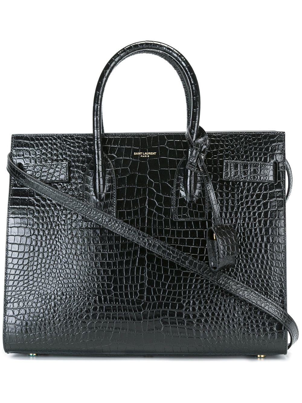 - Saint Laurent (圣罗兰) 黑色 小牛皮 'Sac de Jour'小号手提包。 顶部有弧状手柄, 可拆卸肩带, 正中有品牌标记, 带浮雕及鳄鱼皮效果, 脚钉, 双边可延展, 皮质吊牌, 无开合设计, 金色五金配件。