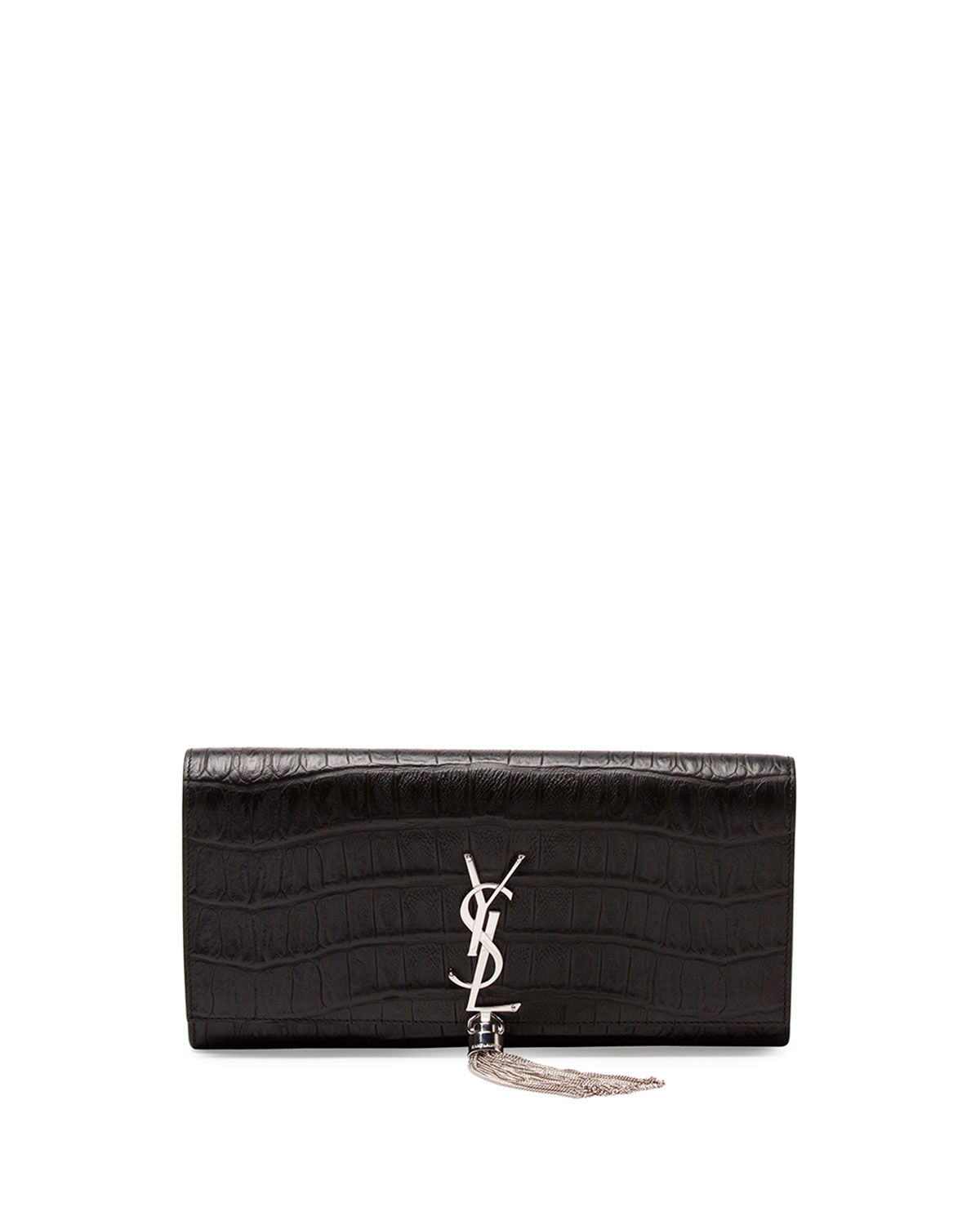 - Saint Laurent crocodile-stamped leather clutch bag.