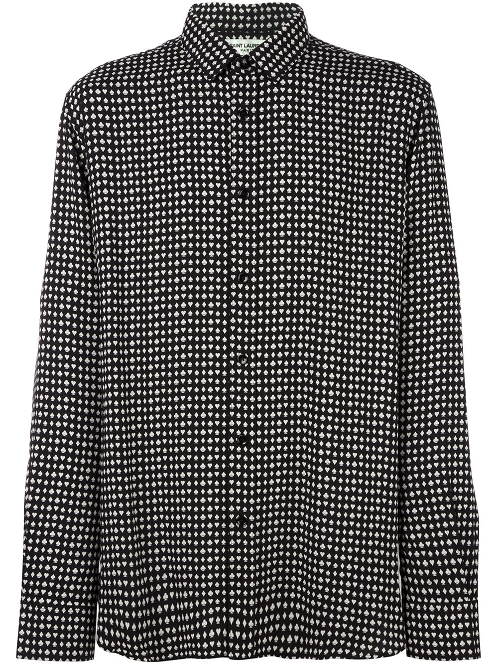 - Black and white playing cards printed shirt from Saint Laurent featuring a classic collar, a front button fastening, an all-over print, long sleeves, button cuffs and a curved hemline.