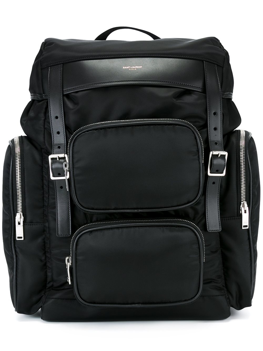 - Saint Laurent (圣罗兰) 黑色 全棉 'Délavé'背包。 顶部有弧状手柄, 可调整肩带, 银色五金配件, 正中有品牌标记, 正面拉链口袋, 侧置拉链口袋, 顶部饰有翻盖, 鞋扣, 抽绳系带, 内置贴袋。