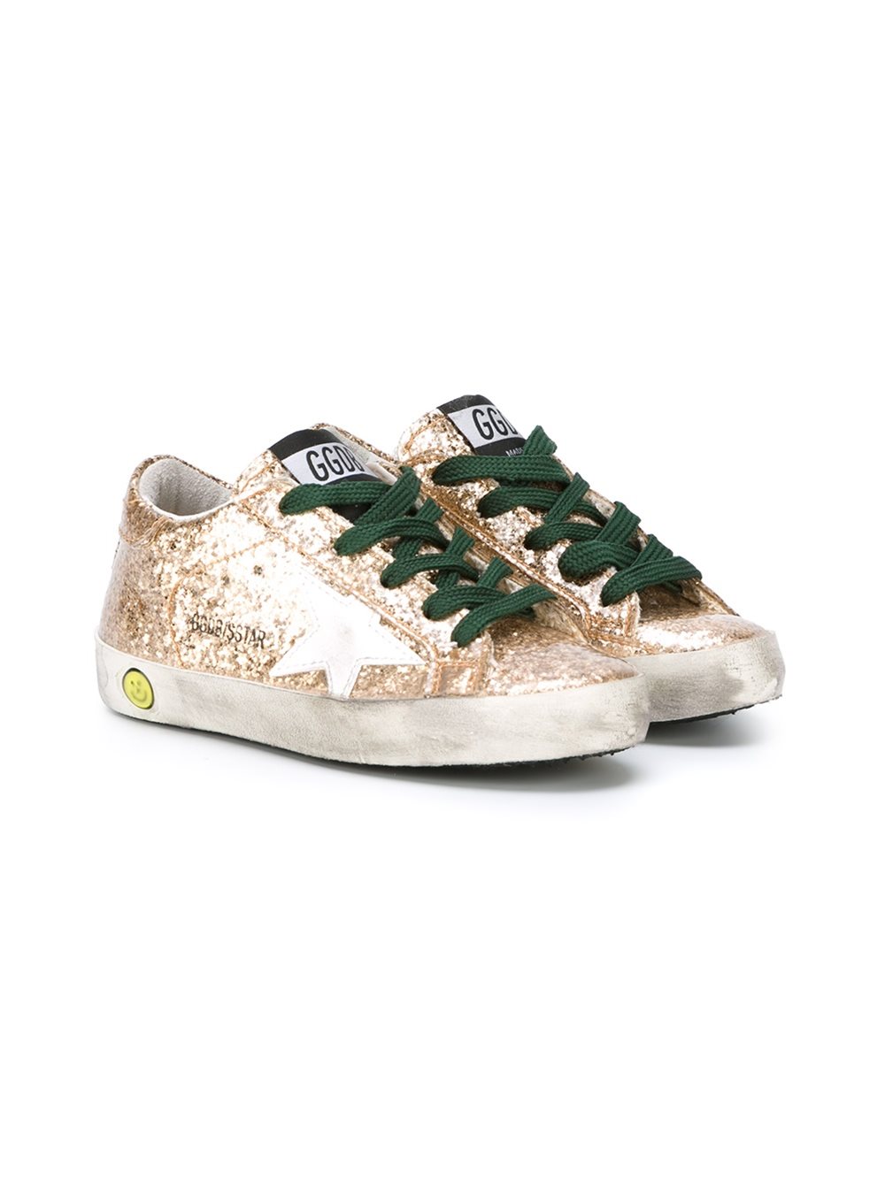 - Browse relaxed footwear styles inspired by pop culture and contemporary art. These gold-tone and white leather 'Super Star' sneakers from Golden Goose Deluxe Brands Kids feature an almond toe, glitter details, distressed effects, a logo patch at the tongue, a lace-up front fastening, a branded insole, a flat rubber sole and a signature star patch to the side. This item is unisex.