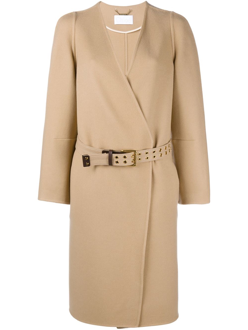 - Chloé 驼色 羊毛 裹身式大衣。 裹身式V领, 系腰带设计, 侧身口袋, 阔长袖。