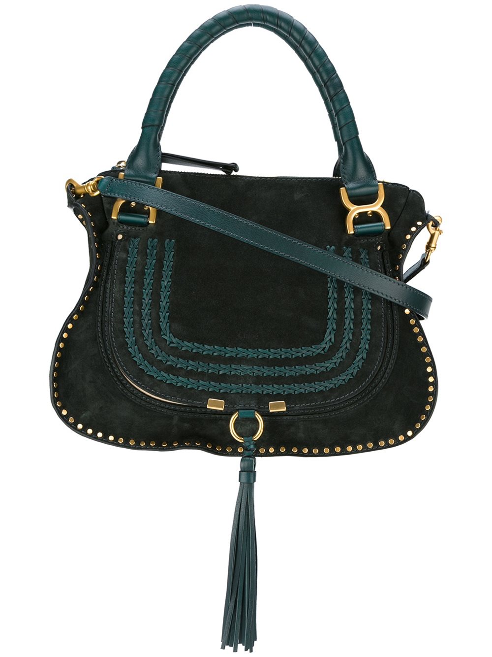 - Chloé (寇依) 绿色 绒面皮与小牛皮 'Marcie' 手提包。 编织式手柄, 流苏挂饰, 金色铆钉, 顶置拉链, 可拆卸肩带, 金色五金配件, 内置贴袋, 内置标贴。