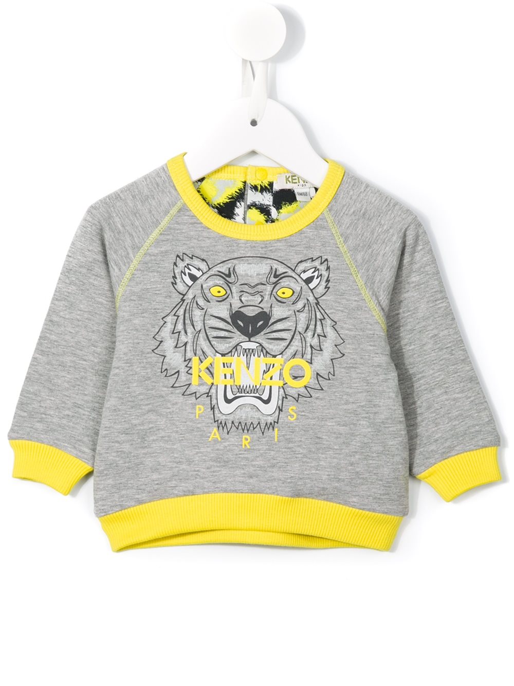 - Cool kids will love the new Kenzo Kids’ collection. Expect lively prints and signature vibrant-hued dresses, T-shirts and sweats. This grey and yellow stretch cotton 'Tiger' sweatshirt features a ribbed round neck, a back snap button closure, long sleeves and a ribbed hem and cuffs.