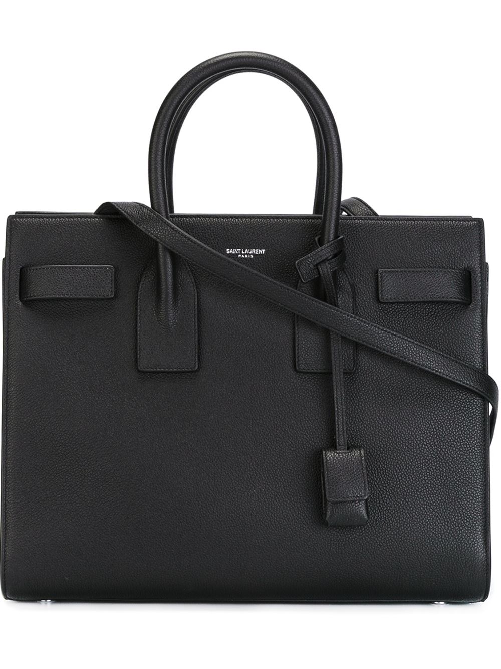 - Saint Laurent 黑色 小牛皮 'Sac de Jour'小号手提包。 方形, 顶部有环状手柄, 可拆卸可调肩带, 皮质吊牌, 正面饰有浮雕品牌标记, 双边可延展, 内置拉链口袋。