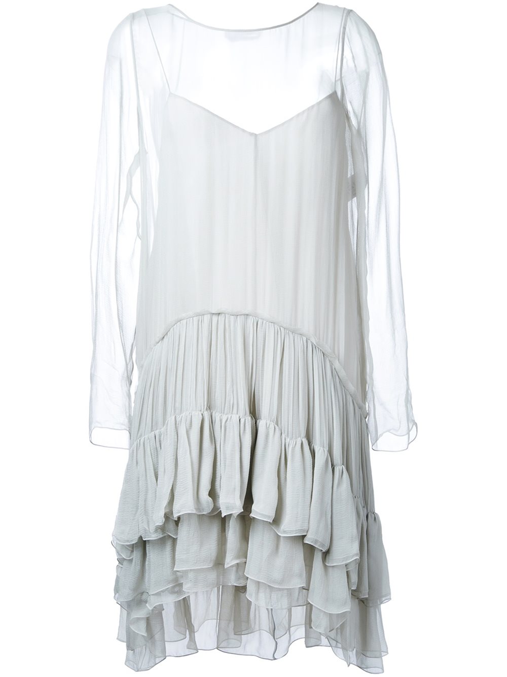 - Grey silk tiered ruched dress from Chloé featuring a round neck, a loose fit, pleated details, a dropped waist, long sleeves, a mid-length and a curved hem.