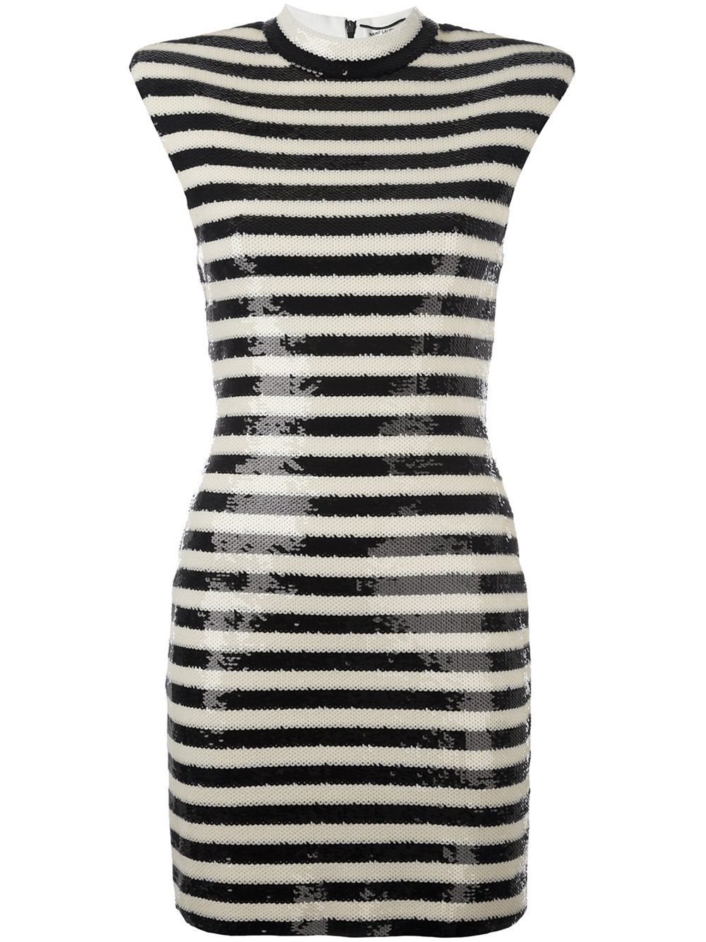 - Saint Laurent (圣罗兰) 黑色与白色 亮片条纹无袖连衣裙。 直领, 条纹, 无袖设计, 后置隐藏式拉链, 直筒裙式廓形, 平直下摆, 短款, 亮片刺绣。