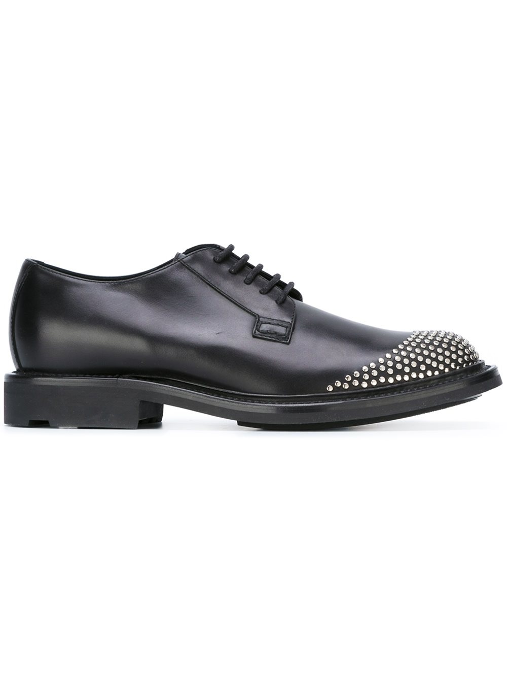 - Saint Laurent (圣罗兰) 黑色 牛皮 铆钉德比鞋。 杏仁形鞋尖, 银色铆钉, 正面绑带, 鞋垫饰有品牌标识, 低跟。