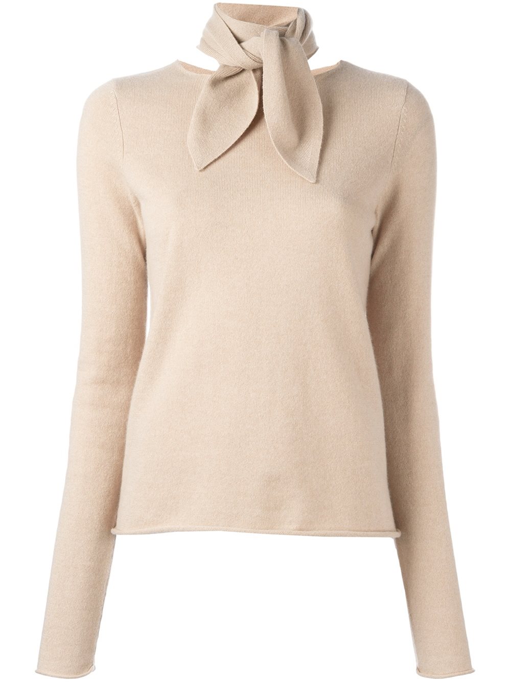 - Chloé (寇依) 骆驼色 羊绒 领巾毛衣。 圆领, 磨损边, 长袖, 平直下摆。