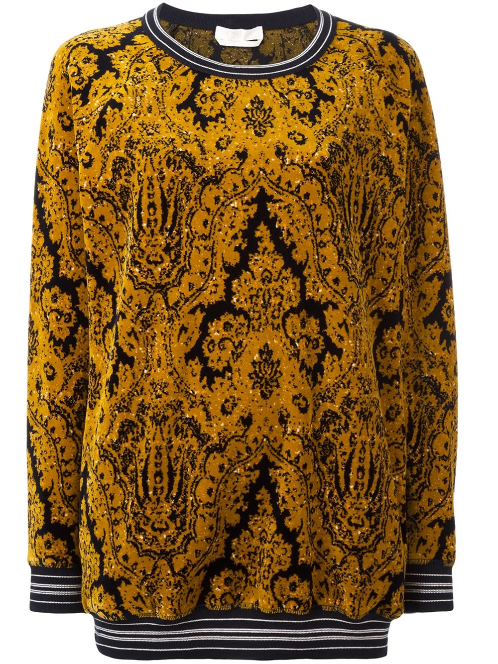 - Chloé (寇依) 褐色 棉质混纺 提花毛衣。 圆领, 罗纹边饰, 长袖, 平直下摆。