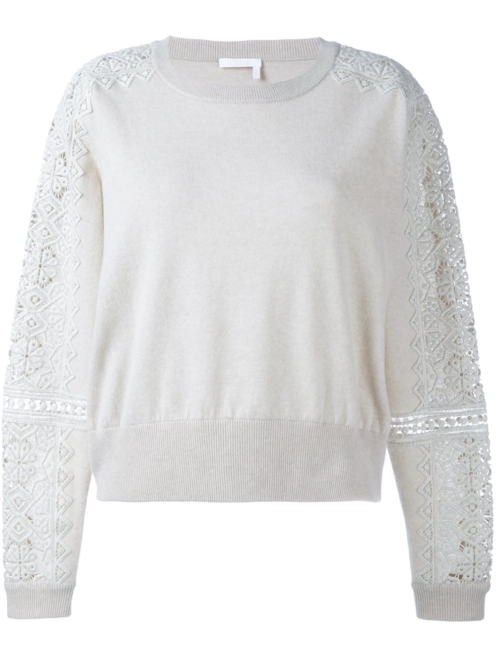 - Ivory merino-cotton-cashmere blend guipure insert jumper from Chloé featuring a round neck, ribbed trimming, long sleeves and a straight hem.