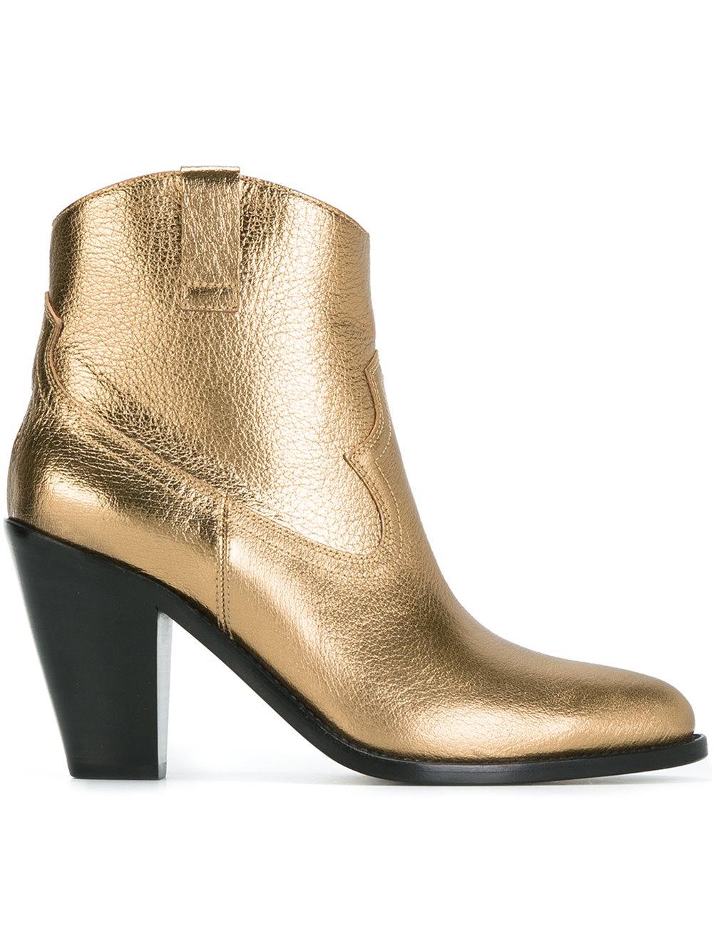 - Saint Laurent (圣罗兰) 金色 牛皮 'Curtis 80'西部牛仔风及踝靴。 杏仁形鞋尖, 侧置拉链, 侧置提鞋环, 叠跟。