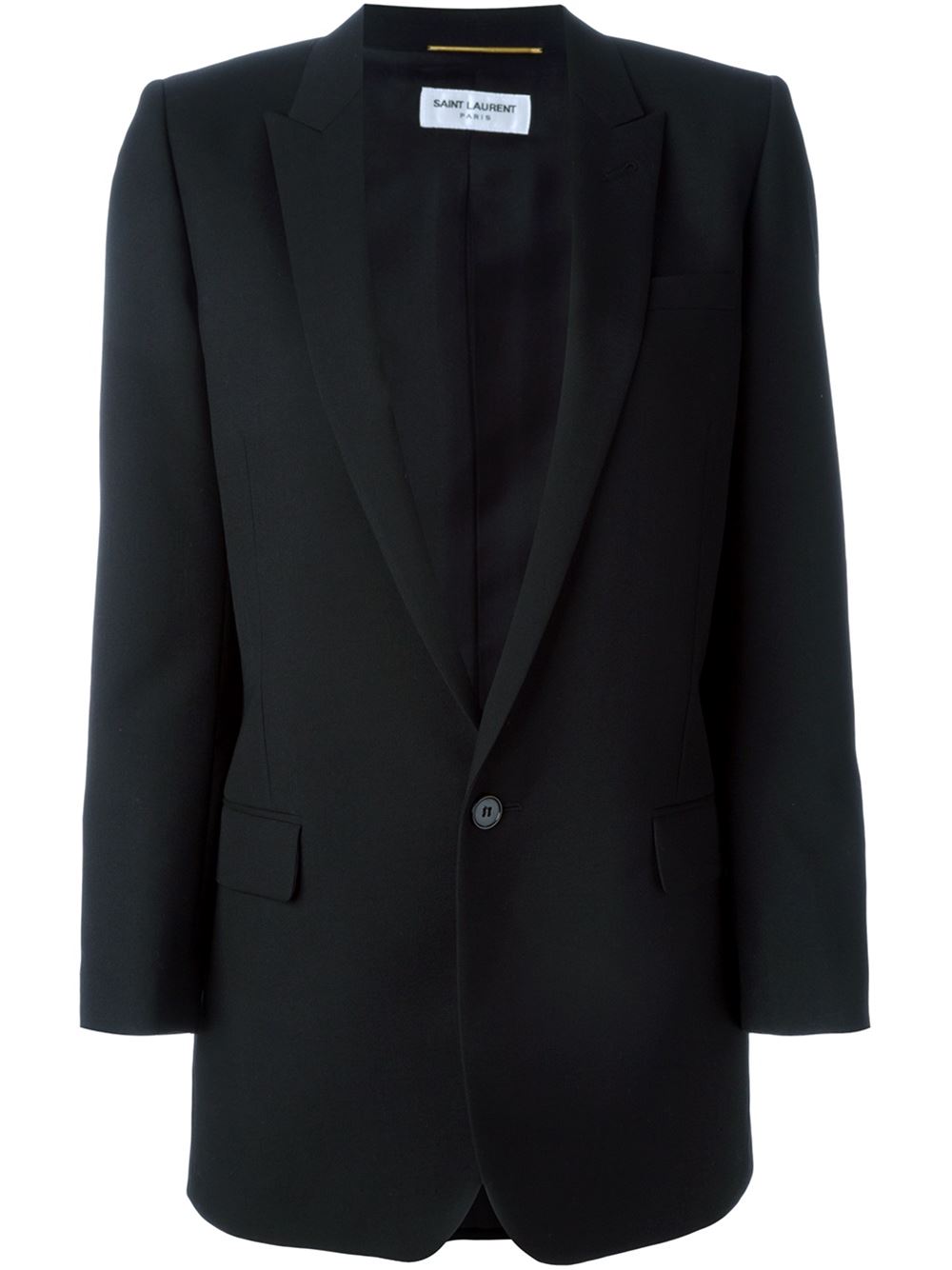 - Saint Laurent 黑色 初剪羊毛 直筒西装夹克。 正面纽扣, 尖翻领, 长袖, 假搭扣袖口, 侧置盖袋, 平直下摆。