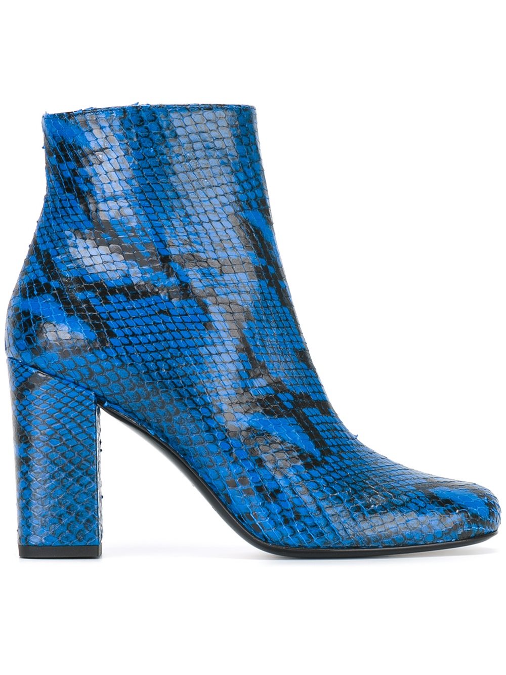- Saint Laurent (圣罗兰) 蓝色 小牛皮 'Babies 90'及踝靴。 杏仁形鞋尖, 侧置拉链, 及踝, 蛇皮效果, 高粗跟。