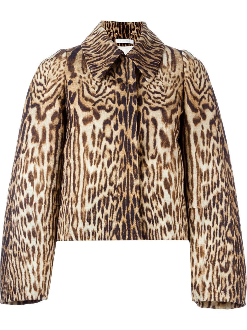 - Chloé 褐色 棉质混纺 豹纹夹克。 切角领, 隐藏式正面开合, 短款, 阔长袖。